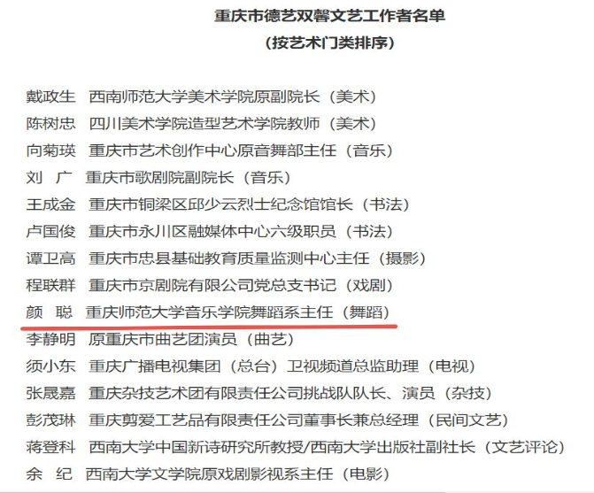 重庆市人力社保局、市文联、市作协、市民族宗教委联合发布了《关于表彰第九届重庆文学和艺术奖(含少数民族文学奖)的决定》,我校音乐学院颜聪教授荣获重庆市“德艺双馨文艺工作者”的称号。