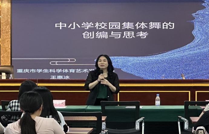 上午10:30,“中小学校园集体舞的创编与思考”专题讲座于博雅楼503会议室顺利召开,主讲人重庆市学生科学体育艺术发展中心王惠冰老师围绕校园集体舞的背景、转型、定位、创编、推广及思考六大维度为在场百余位全市中小学美育教育工作者展开深度剖析。在谈到校园集体舞的转型时,王老师指出随着教育理念的更新,校园集体舞应更加注重学生的个性化发展和多元文化的融合。对于校园集体舞的定位,强调要以促进学生身心健康、培养审美情趣和团队合作精神为目标。