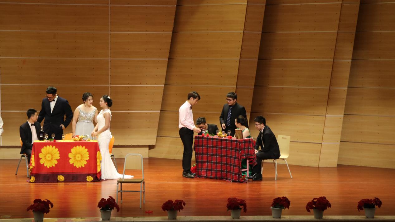 在聚会中,“豪”由2015级本科生甘家豪饰演,“宁”由2015级本科生安宁饰演,“艳”由2015级本科生黄艳饰演,“中”由2015级本科生梁垫中饰演,“莲”由2014级本科生李淑莲饰演,“靖”由2013级本科生贺靖饰演,“霖”由2014级本科生周凯霖饰演,“展”由2014级本科生张展饰演,“汁”由重庆八中学生陈泫汁饰演,“逸”由2015级研究生刘家逸饰演,“唐”由2014级研究生唐联桃饰演,“婕”由2014本科生张婕饰演,“强”由2013级本科生王仲强饰演,“江”由2013级本科生黄江饰演,“王”由王世让老师饰演,“文”由2016级研究生付雅文饰演。
