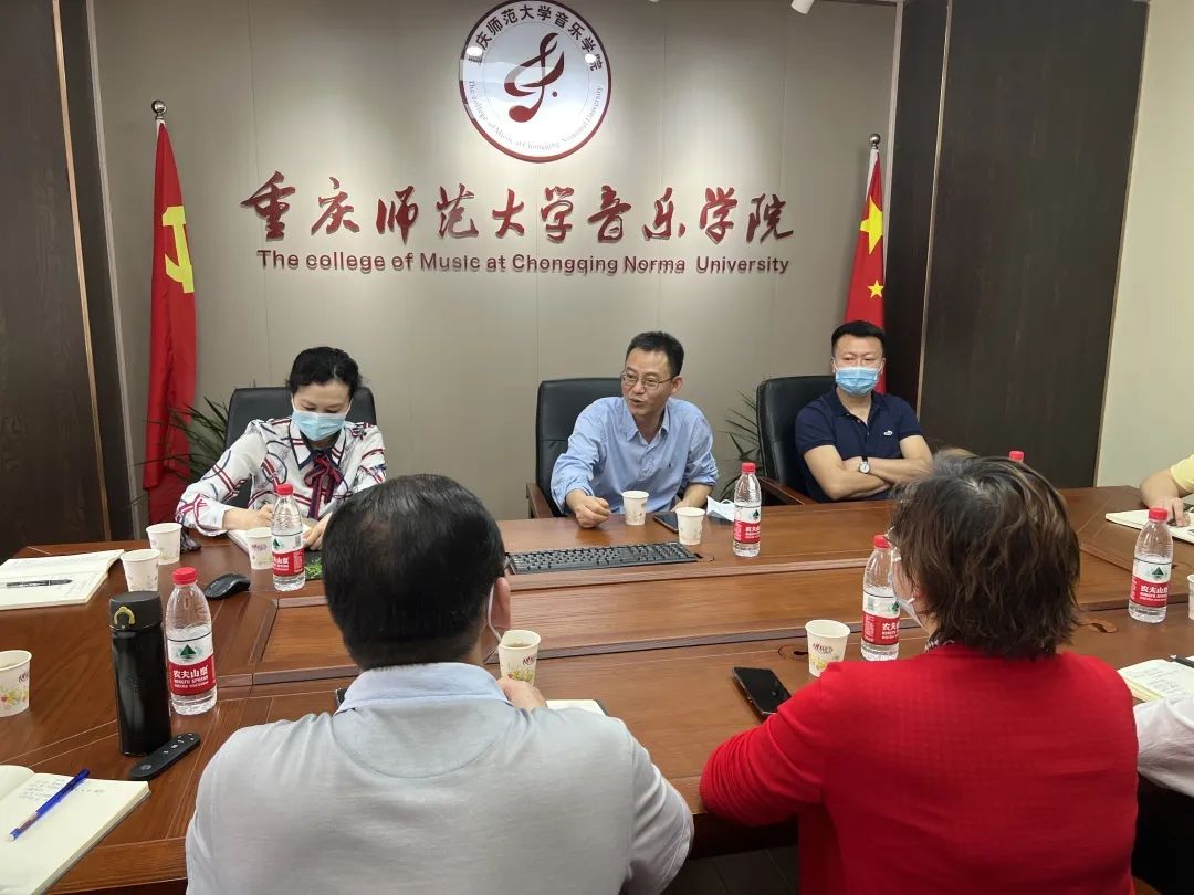 2022年3月19日,重庆师范大学董景荣副校长、研究生院院长李荣、副院长张立、杨俊和冉亚辉一行莅临音乐学院,检查指导工作。
