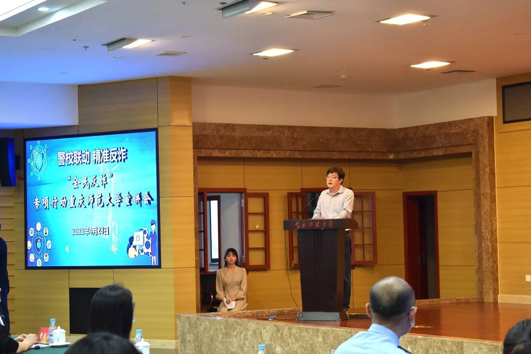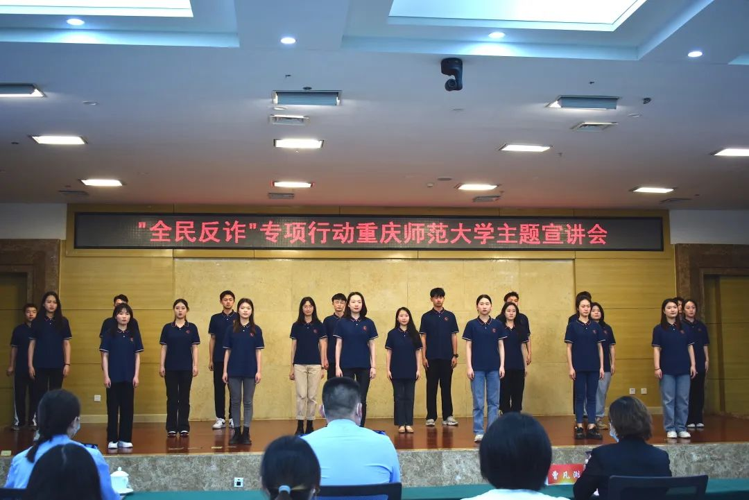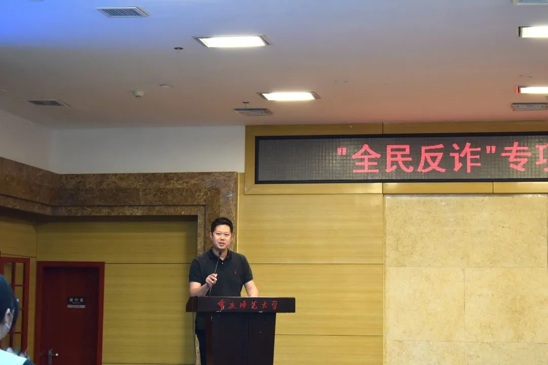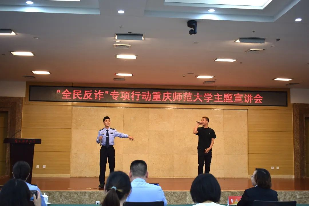 随着现代科技的发展,我们的生活有了极大的改善,但这也促使了许多人利用高科技诈骗钱财,破坏人们的财产利益。为进一步提高在校师生的防电信诈骗的意识和能力,有效遏制校园电信诈骗案件的发生,避免财产损失。2022年4月28日14点30分,由重庆高新区公安分局和重庆师范大学联合主办,音乐学院承办的“警校联动 精准反诈”主题宣讲会于博雅楼504会议室成功举行。yl1111永利集团党委书记曾凡浏、重庆高新区公安分局治安支队支队长唐治洋、音乐学院正处级组织员鲁福崇、治安支队副支队长兼女子突击队队长苏兰、保卫处副处长李鑫、yl1111永利集团党委副书记宋雪飞,以及我院2021级音乐表演一班、二班同学共同参与了此次别开生面的反诈公开课。