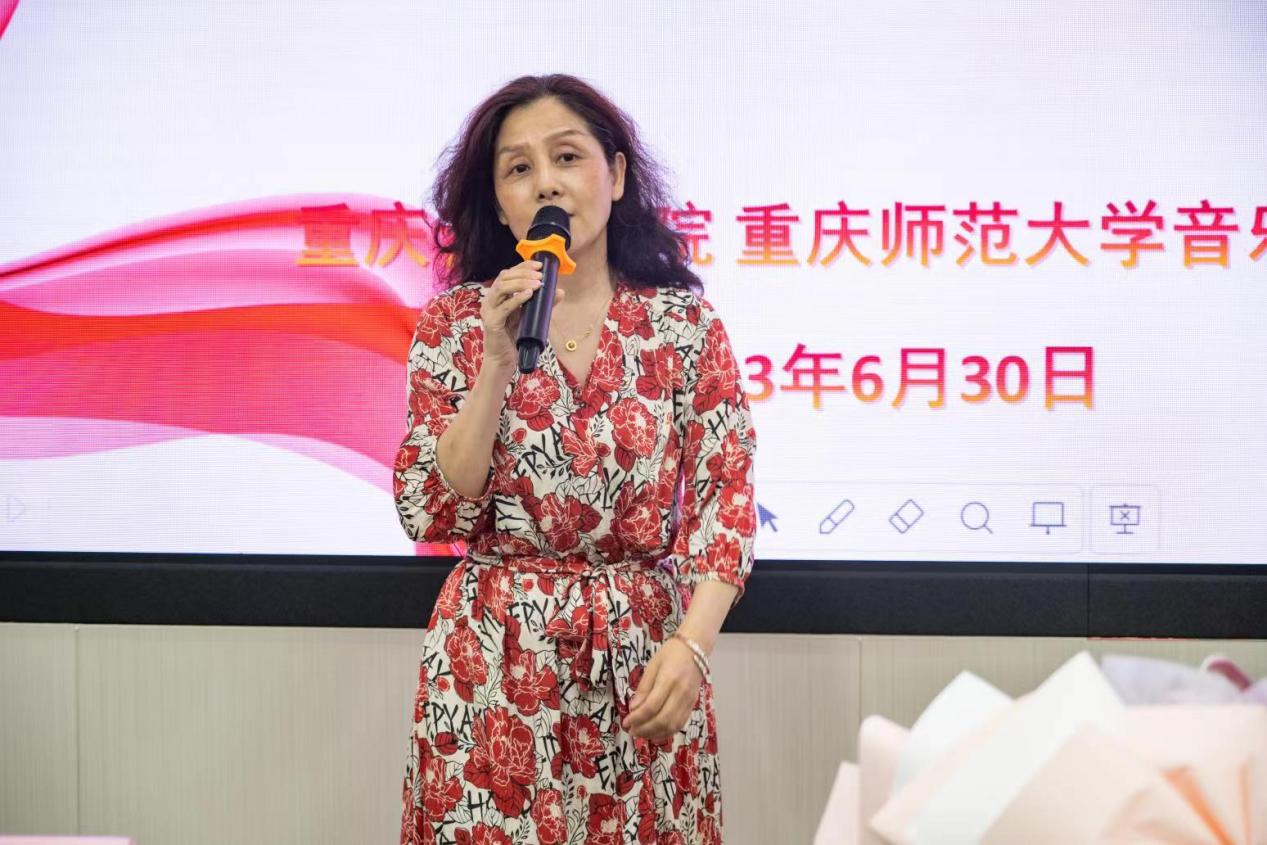 之后,学院郑华副院长(主持工作)代表学院致辞。时光匆匆,岁月里流光溢彩,数十载桃李芬芳,历史的画面见证者学院的发展,一砖一瓦里蕴含着你们的汗水,饱含着你们的深情。退休教师是学院宝贵的财富,郑华副院长代表学院对几位教师表示了感谢,一是感谢缘分,感谢让我们相聚在重师音乐学院,二是感谢岁月,学院荣誉的背后,是你们岁月的风霜,三是感谢支持,感谢你们背后的亲人、家人、爱人。“落花不是无情物,化作春泥更护花”,学院正走向成熟辉煌的明天,希望几位教师继续以一颗仁爱宽容的心,关爱着学院、颂扬祝福着学院,关注着学院成长的每一步。同时代表学院全体师生对退休教师送上最衷心的祝福,祝福你们健康长寿,老有所为,老有所乐,阖家幸福,万事如意。