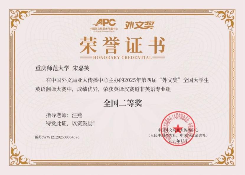 近日,由中国外文局亚太传播中心主办的2025年第四届“外文奖”全国大学生英语翻译大赛结果揭晓。我院宋嘉笑同学,将音乐专业的语言感知力与跨文化表达素养融入翻译实践,凭借扎实的语言功底和灵动的翻译巧思,在英译汉赛道非英语专业组的激烈角逐中脱颖而出,荣获全国二等奖!