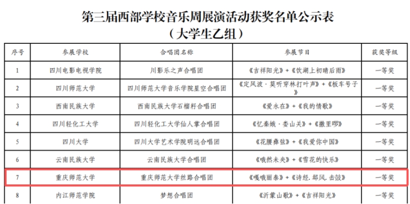 近日,由四川、重庆、贵州、云南四省(市)教育厅(教委)联合主办的“音润心灵 向美而行”第三届西部学校音乐周展演活动在四川成都圆满落幕。经重庆市教委遴选推荐,重庆师范大学丝路合唱团代表重庆市高校参加大学生乙组展演,并以出色的表现荣获一等奖,在广阔西部唱响重师学子青春风采。
