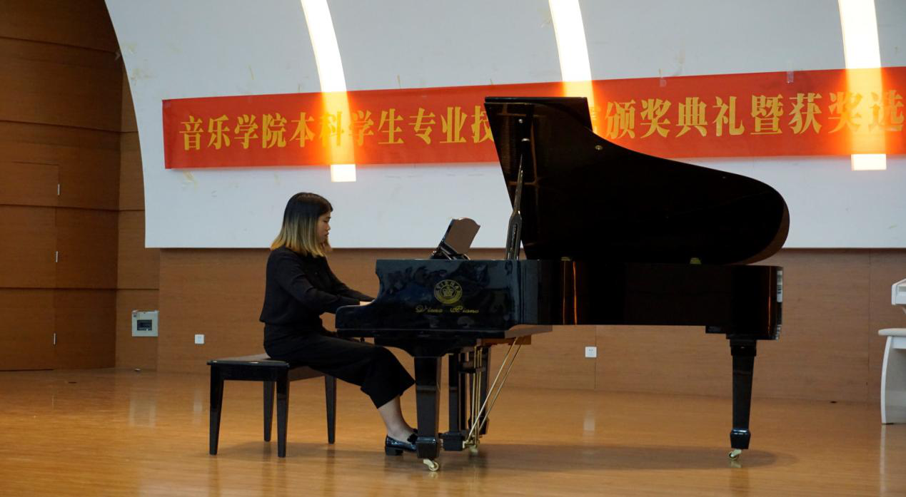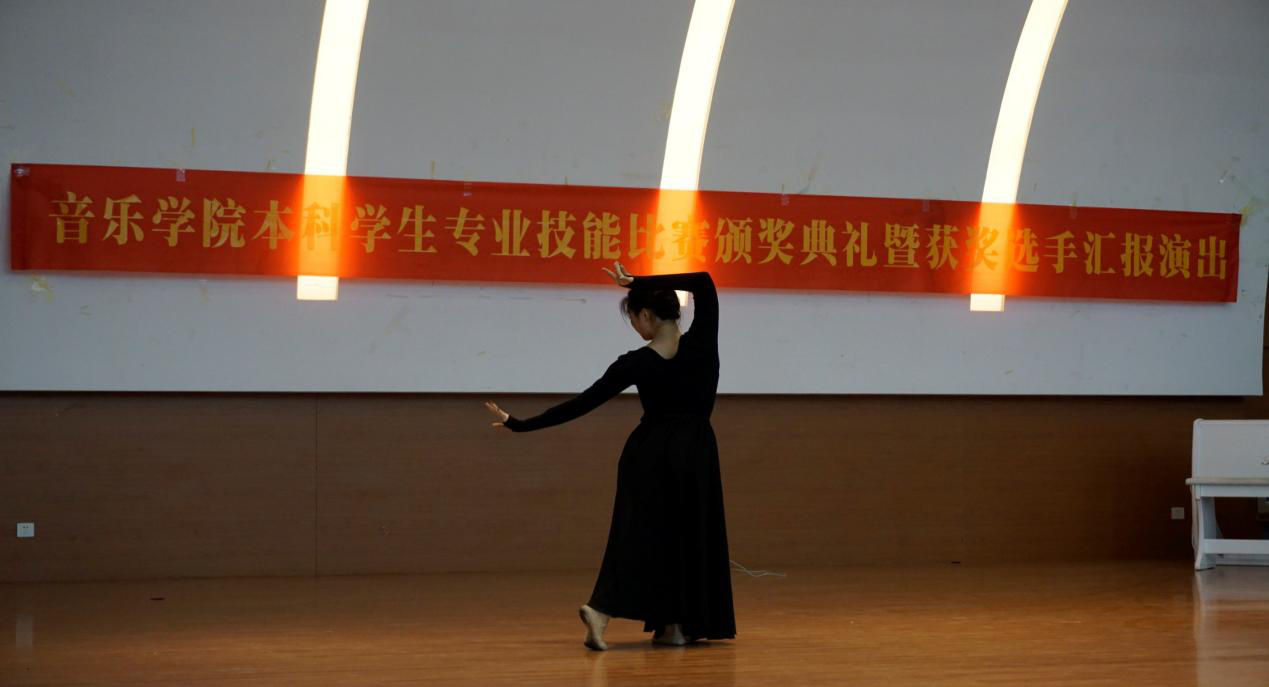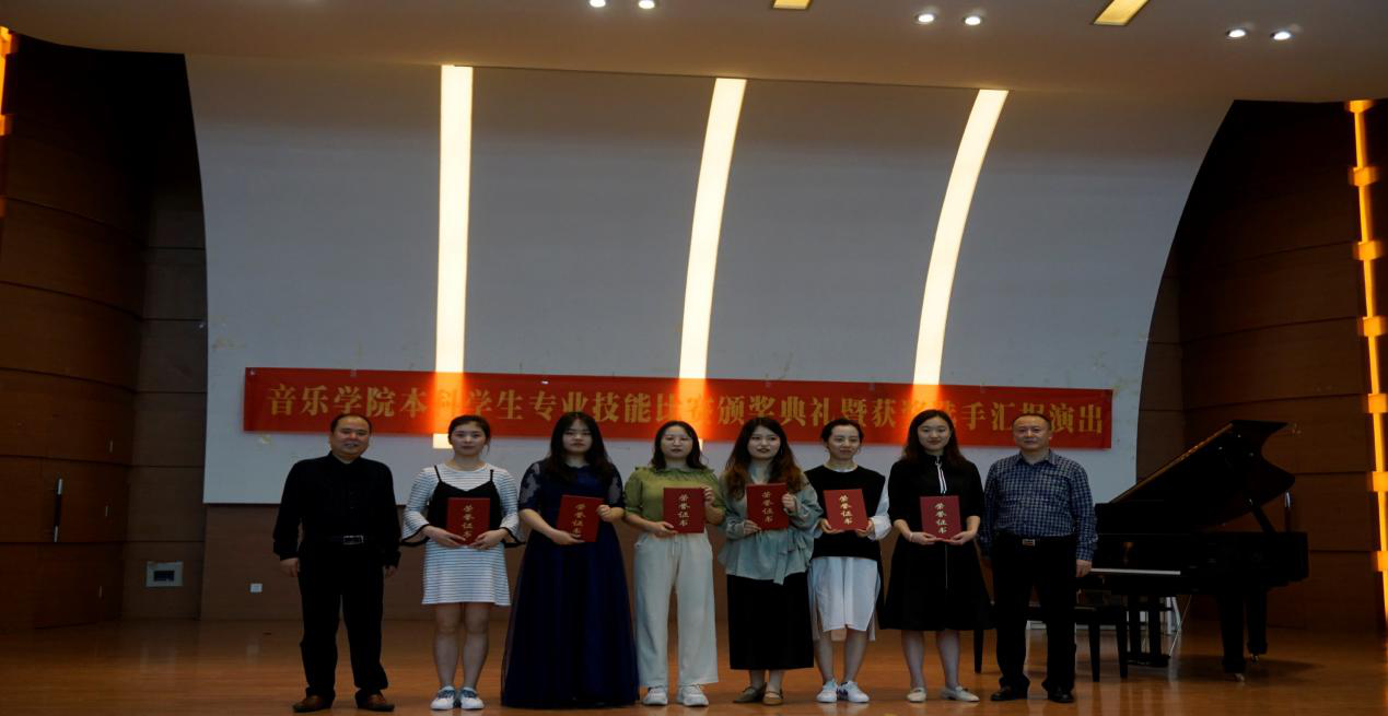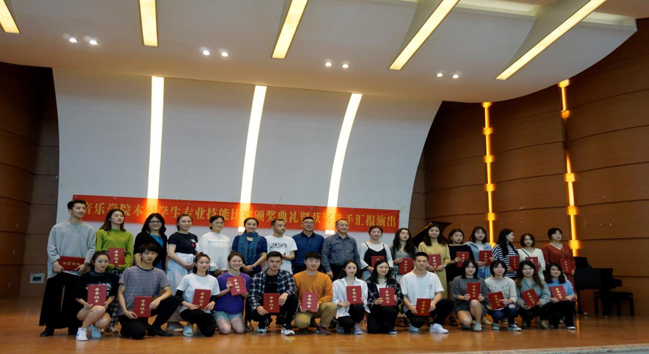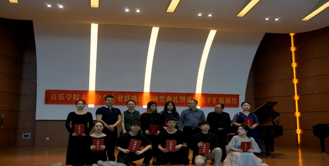 2019年4月18日下午16:00,“音乐学院本科生专业技能比赛颁奖典礼暨获奖选手汇报演出”在音乐学院8459排练厅顺利举行。音乐学院副院长孙伟、教科办主任崔凤明、音乐学系主任齐江、音乐表演系主任吴婧瑀、舞蹈系主任颜聪、声乐教研室主任王守梅、钢琴教研室主任李雪莲、流行音乐教研室主任谭安平、理论教研室主任杜刚、舞蹈教研室主任邓、王培出席观看了此次音乐会并对优秀学生进行了颁奖。孙伟副院长在致辞中表示:举办此次本科生技能汇报音乐会的目的是希望同学们在竞争中互相学习,取长补短,激发同学们的学习积极性。