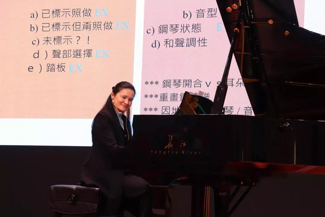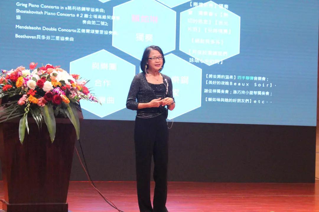 最后是赖如琳教授主讲的“钢琴重奏合作艺术”,钢琴重奏,包括四手联弹、双钢琴,及其他更多的双手合奏,是钢琴弹奏者在独奏以外、同等重要的学习与表演管道。其中,赖教授强调对于肢体活动的配合、音色的琢磨、曲析乐念的一致性都需要演奏者投注一定的体会和训练。在此次讲座中,赖教授和有兴趣发展此学问者一起更深入乐趣无穷的钢琴重奏世界。
