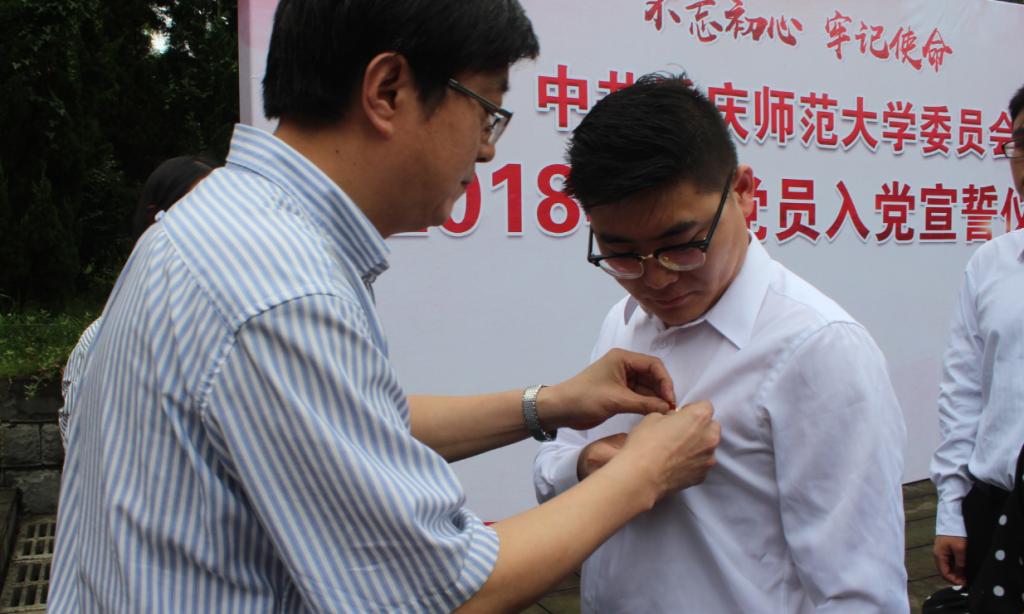 其后,党委书记鲁福崇同志为新党员佩戴党员徽章。