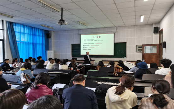 接下来,我院市级在线开放课程立项获得者孙伟教授讲授了《钢琴即兴伴奏》课程。孙伟老师讲解细致生动,由浅入深,学生在老师讲解过程中进行练习,孙伟老师运用超星学习通进行辅助教学,为老师们展示了如何利用现代化教学辅助工具丰富课堂教学,提升课堂教学效果。