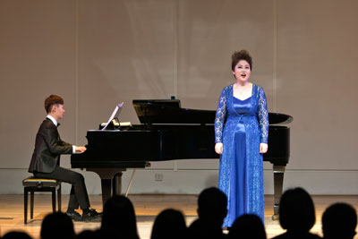 爱情,是人类永恒的主题,2015年3月29日晚,女高音歌唱家、yl1111永利集团教授肖晓莲在北京大学百周年纪念讲堂多功能厅为观众们带来了意大利声乐作品专场独唱音乐会,这些作品的时间跨度从十六、十七世纪巴洛克的古典声乐,一直到十九世纪的威尔第、普契尼的经典歌剧片段,其中大部分作品都是与爱情这一主题相关,表现出或是明媚灿烂,或是委婉曲折的百态爱情,百态人生。肖晓莲首先带来了一曲卡契尼的艺术歌曲《阿玛丽莉》,这首歌曲被许多声乐教科书列入书中第一首歌曲的位置,肖晓莲用她细腻感人的声线对爱人诉说着一腔真挚的爱情,情感处理极为清晰而富有层次性,开始的部分如喃喃自语,平和而深情,随后感情不断积累,情绪不断高涨,乐曲也不断升华,满腔爱慕最终终于热烈地爆发出来,“ 打开我胸膛,你必可看到写有: 阿玛丽莉,阿玛丽莉,阿玛丽莉是我的爱人”。洛蒂的《请告诉我,哦,美丽的小嘴》在肖晓莲的演绎下则是别开生面,洋溢着青春活泼的气息,音色饱满而柔和。随后的《假如你爱我》当中,肖晓莲化身为爱慕着牧羊少年的女孩,享受着爱情的甜蜜、烦恼,甚至忧伤、愤怒,情感转变的处理极为自然生动,唱到动情处她微蹙着眉,观众的心也随着被揪了起来,在她华丽的唱腔中感受着爱情带来的永恒的痴狂的状态。下半场歌剧选曲中,肖晓莲首先带来了威尔第《一日国王》中的经典选段,高超的演唱技巧引得观众“bravo”声连连,随后她的学生,北京大学信息管理学院2013级本科生傅一程登台,用与远超年龄的大气与技巧为观众带来了富有感情与力量的演唱,观众热烈的掌声也给了她莫大的肯定与支持。接下来肖晓莲带来的两曲普契尼以东方为背景创作的经典歌剧中的选段——《蝴蝶夫人》中经典咏叹调《晴朗的一天》和《图兰朵》中柳儿的咏叹调《你冷若冰霜》,两曲经典曲目经过她圆醇的嗓音和丰沛细腻的感情处理下格外催人泪下,令观众沉醉在她的完美而又动人的歌声中。整场演出气氛非常热烈,观众叫好声连连,最后,肖晓莲献上一曲返场曲《亲爱的爸爸》,留给观众对于爱情的无限遐思。
