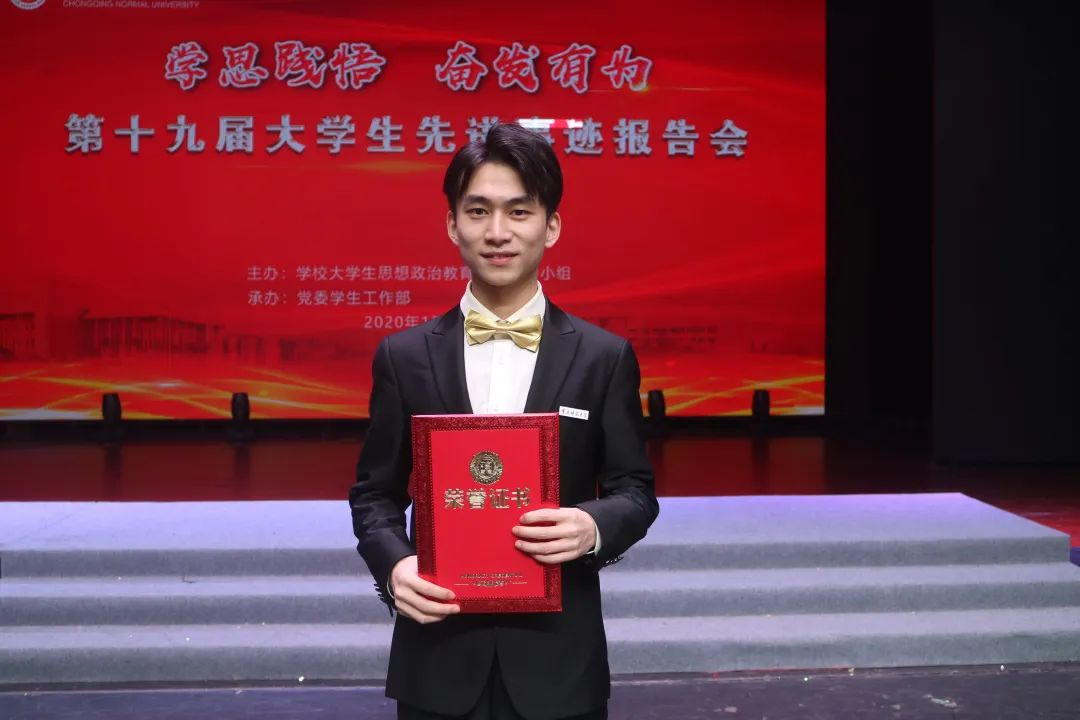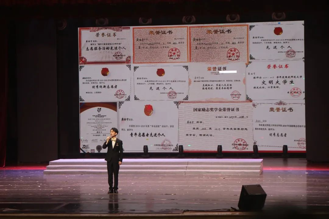 龚浩宇,男,1999年9月生,中共预备党员,音乐学院音乐表演(声乐)专业2018级本科生,现担任音乐学院学生会执行主席;在校期间专业综合成绩一直名列前茅,多次获得综合一等奖学金、国家励志奖学金、2018-2019重庆师范大学“文明大学生”、2018-2019暑期大学生社会实践“先进个人”、2019-2020重庆市青年志愿者先进个人、重庆师范大学优秀志愿服务工作者、重庆师范大学精神文明先进个人;曾获得第五届“格乐蓝”杯艺术节声乐大赛一等奖、第六届KJC韩中国际音乐大赛专业演唱组一等奖等。