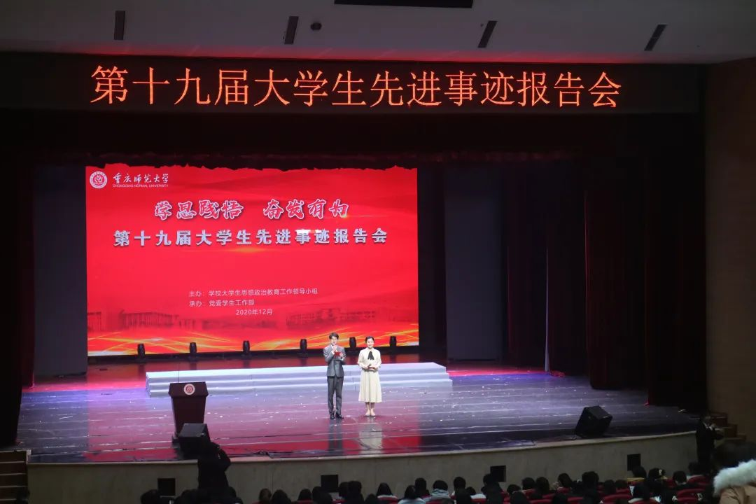 2020年 12月24日下午,我校“学思践悟 奋发有为”第十九届大学生先进事迹报告会在校友会堂演出厅隆重举行。校党委书记曾礼,校党委副书记、校长孟东方,校党委副书记陈志军出席了本次报告会,参加这次报告会的还有相关职能部门及各学院师生代表。